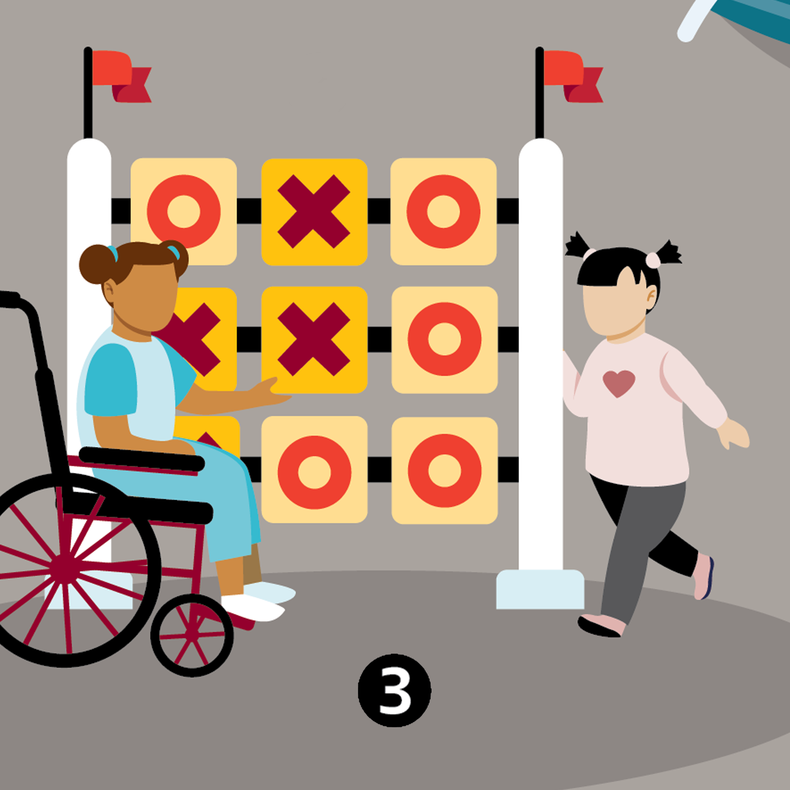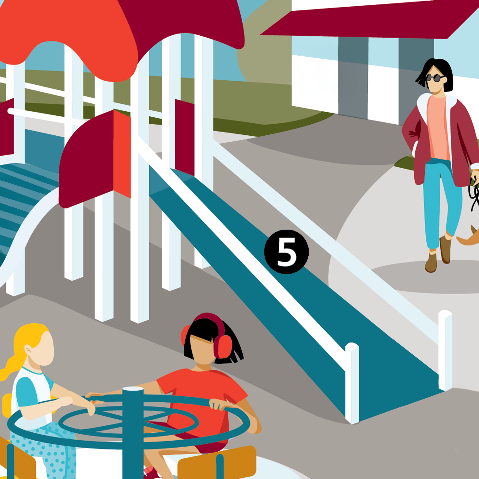 This illustration shows examples of some inclusive playground features that can help communities learn and play together.